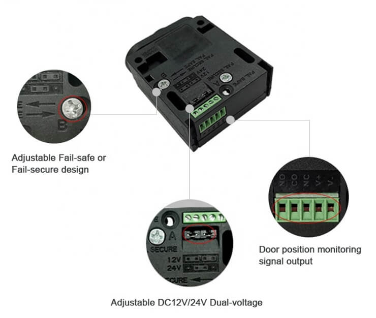 ◆ Adjustable fail-safe (power to lock) or fail-secure (power to open), according to user's need.
